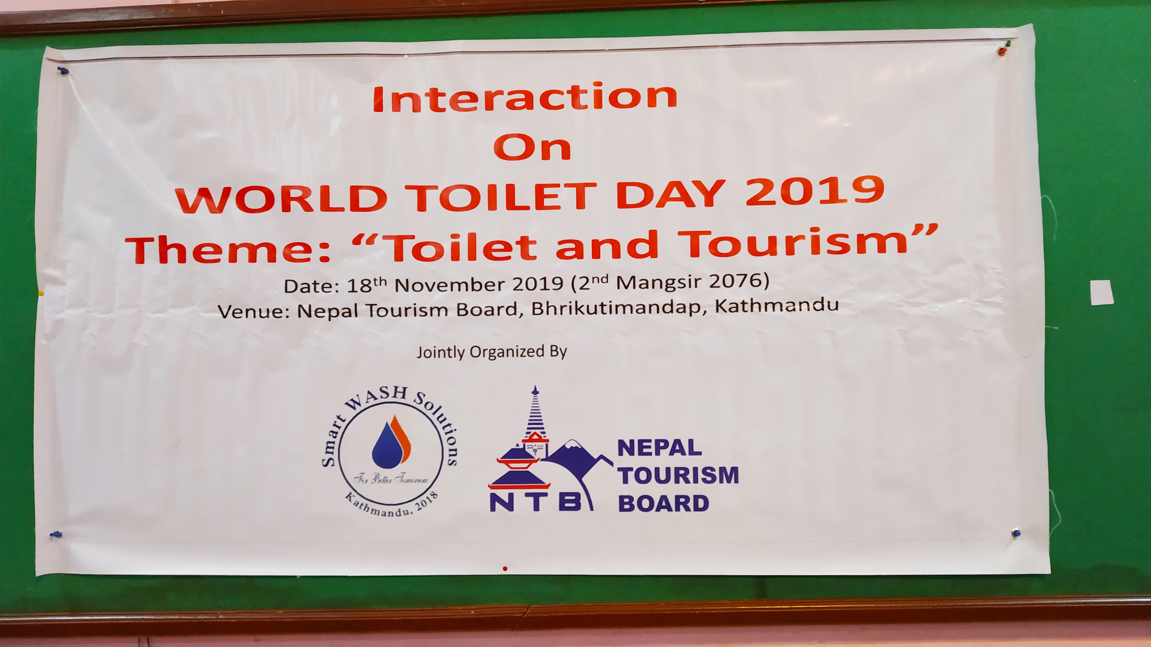 Nepal Tourism Board and Smart WASH Solutions jointly organizing a half-day interaction program on the occasion of World Toilet Day 2019 with the theme "Toilet and Tourism” on 18th November 2019, Monday at 2 PM at Nepal Tourism Board, Bhrikutimandap, Kathmandu. The chief guest of the program was Mr. Danduraj Ghimire. The program included two technical presentations with a Q/A session.